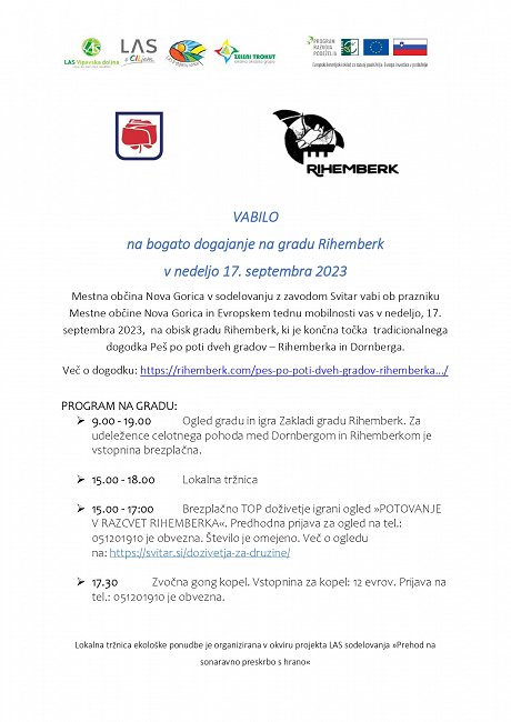 Mestna občina Nova Gorica v sodelovanju z zavodom Svitar vabi ob prazniku Mestne občine Nova Gorica in Evropskem tednu mobilnosti vas v nedeljo, 17. septembra 2023, na obisk gradu Rihemberk, ki je končna točka tradicionalnega dogodka Peš po poti dveh gradov – Rihemberka in Dornberga.