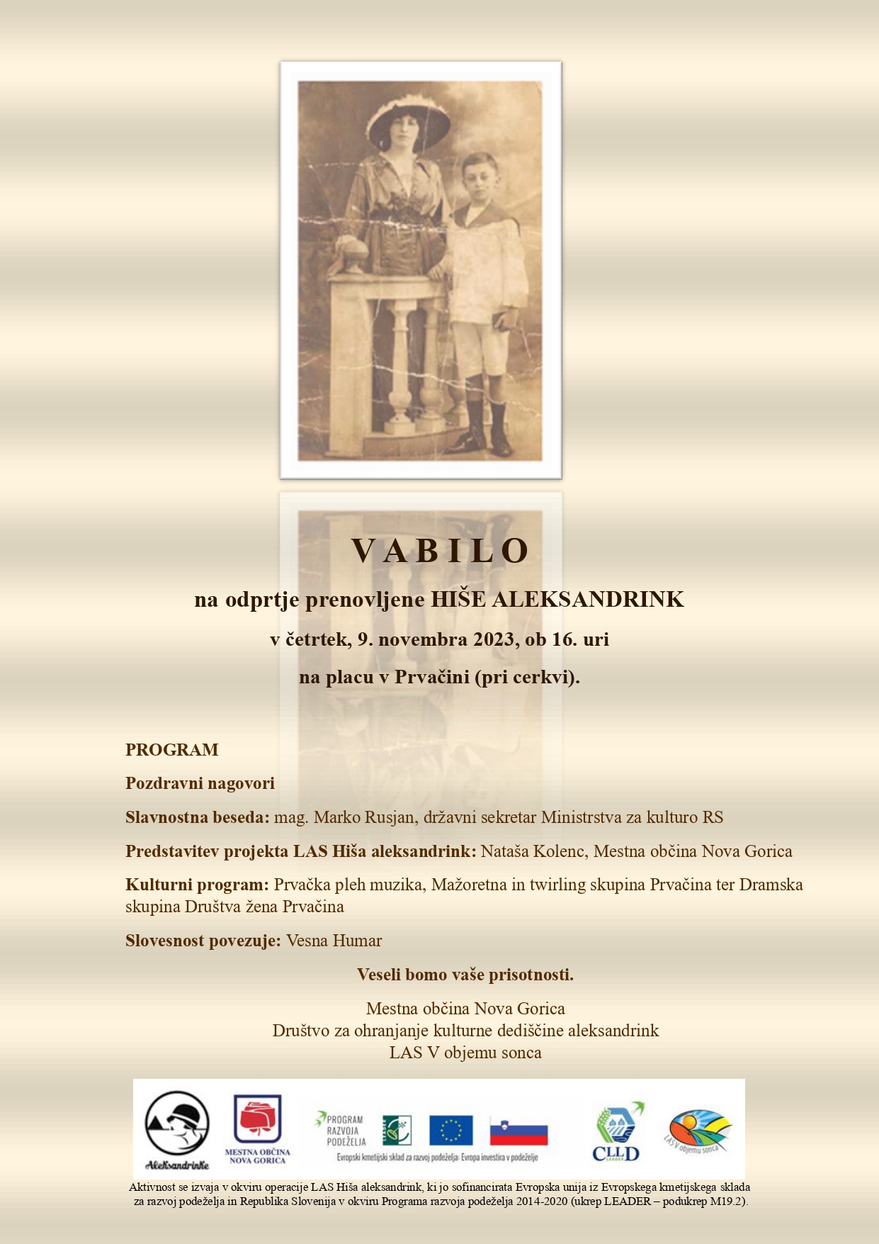 Prenova HIŠE ALEKSANDRINK se je izvedla v okviru projekta LAS HIŠA ALEKSANDRINK, iz Strategije lokalnega razvoja LAS V objemu sonca 2014-2020.