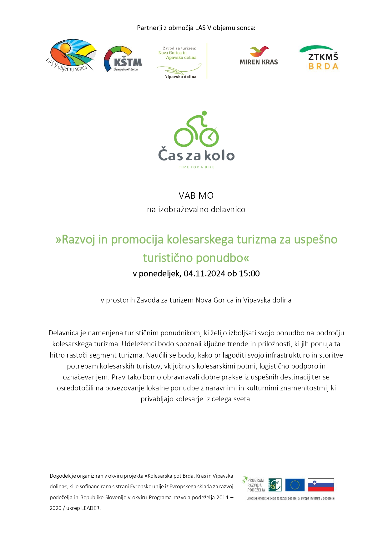 Javni zavod za turizem Nova Gorica in Vipavska dolina, v okviru projekta »Kolesarska pot Brda, Kras in Vipavska dolina« organizira v ponedeljek 4. novembra 2024, ob 15. uri v prostorih Zavoda za turizem Nova Gorica in Vipavska dolina, zanimivo DELAVNICO na temo »Razvoj in promocija kolesarskega turizma za uspešno turistično ponudbo«.
