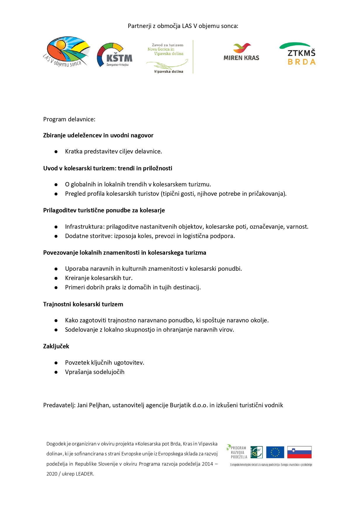 Delavnica je namenjena turističnim ponudnikom, ki želijo izboljšati svojo ponudbo na področju kolesarskega turizma.