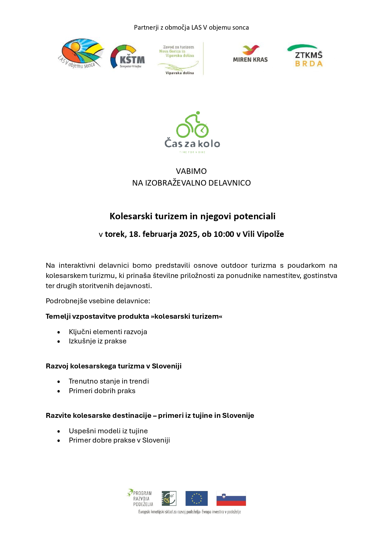 ZTKMŠ Brda, partner projekta »Kolesarska pot Brda, Kras in Vipavska dolina«, v okviru celodnevnega dogajanja, organizira strokovno izobraževanje na temo kolesarskega turizma "Kolesarski turizem in njegovi potenciali"