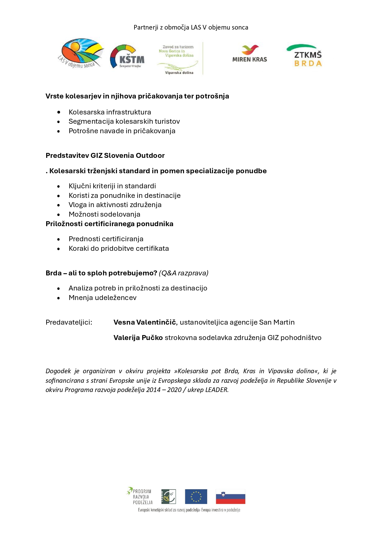 Dogodek je namenjen turističnim ponudnikom, ki želijo izboljšati svojo ponudbo na področju kolesarskega turizma in pridobiti koristna znanja za uspešno promocijo.